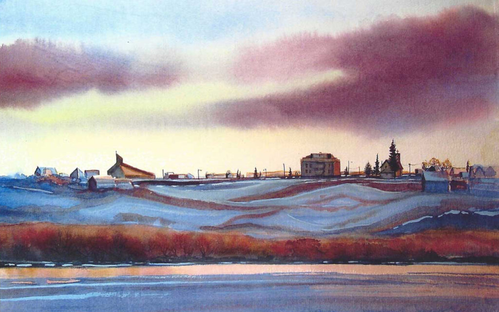 This artwork is a water colour painting by a former St. Vital parishioner, Dean Bauche. The work was created to commemorate the 125th anniversary of St. Vital Parish in 2002. It depicts St.Vital parish buildings in the historic site of Battleford as it is seen from across the North Saskatchewan River. Our past and present are connected with this view of our historic church (1883-1983) and our present building. Dean’s work can be found in both private and public collections across Canada.